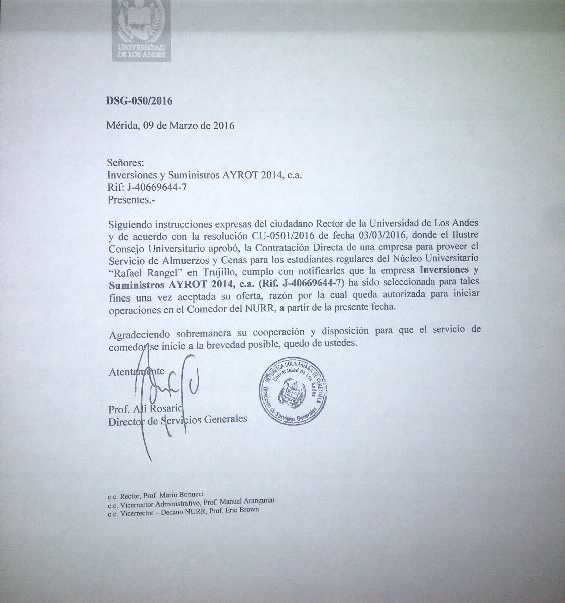 Este miércoles circuló en redes sociales información firmada por el Decano Vicerrector del “Núcleo Universitario Rafael Rangel”, Eric Brown, referente a la contratación de la empresa Ayrot para que se encargue del comedor de esta localidad, afirmando que según  el Director de Servicios Generales, Alí Rosario, el lunes se reunirá la Comisión de Contrataciones para redactar el acto motivado de contratación de esta empresa, por lo cual, hasta tanto no se firme la adjudicación por el Ciudadano Rector, no se podría iniciar el servicio, lo cual se estima ocurra a finales de la próxima semana.