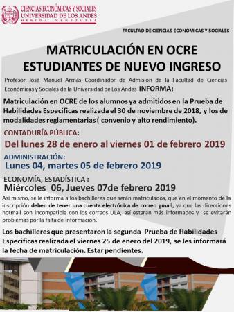 La Facultad de Ciencias Económicas y Sociales de la Universidad de Los Andes (Faces), informa a los estudiantes de nuevo ingreso, el inicio del proceso de matriculación en la Oficina Central de Registros Estudiantiles (Ocre), para los alumnos ya admitidos en la Prueba de Habilidades Especificas, realizada el pasado 30 de noviembre del 2018, así como los de modalidades reglamentarias (Convenio y alto rendimiento).
