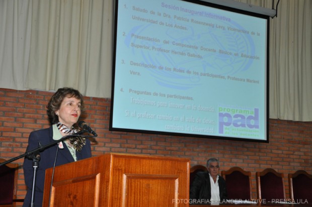 La profesora Patricia Rosenzweig Levy, como vicerrectora académica de la ULA, dio la bienvenida a estos profesores universitarios que buscan mejorar su calidad del proceso enseñanza-aprendizaje en el aula de clase y los felicitó por tomar tan digna actitud. Recordó que estos cursos han llamado la atención en otras universidades del país por las innovaciones que en ellos se han creados; caso específico, la pizarra digital.