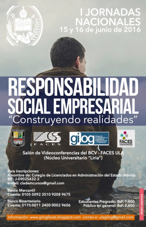 La Facultad de Ciencias Económicas y Sociales de la Universidad de Los Andes (Faces) y el Grupo de Investigación de Legislación Organizacional y Gerencia (Gilog), invita a toda la comunidad universitaria y merideña a participar en el evento “Responsabilidad Social Empresarial: Construyendo Realidades”, que se realizará los días 15 y 16 de junio de 2016. Este evento contará con la participación de destacados ponentes, videoconferencias y mesas de trabajo, con temas de gran interés.
