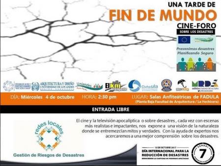 La Facultad de Arquitectura está invitando a la comunidad universitaria y merideña en general, para que participen en el “Cine-foro sobre los Desastres”, el cual se realizará este miércoles 4 de octubre a las 2 y 30 de la tarde, en el que expertos analizarán estas catástrofes que surgen a partir de los fenómenos naturales. Esta actividad está siendo organizada por las Redes Locales de Gestión de Riesgos mediante la mirada o una óptica del cine, buscando con ello crear conciencia sobre la verdadera cara de los desastres.