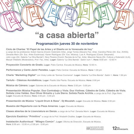 Con motivo del XII aniversario de la Facultad de Arte de la Universidad de Los Andes, está prevista la realización del evento “A casa abierta”, actividad académica y de extensión que inicia este 29 de noviembre con el recibimiento de los profesionales egresados, quienes se reunirán en la galería “Nory Pereira” de esa dependencia universitaria.
