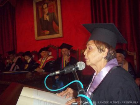 Dra. Melva Díaz de León. (Foto: Lánder Altuve) Con la formalidad del caso, el evento fue desarrollándose en principio con las palabras brindadas por la profesora Eduvigis Solórzano, en representación de los integrantes de la promoción, quien recordó con expresiones emotivas los años de estudiantes y cada una de las anécdotas vividas con los profesores de la época, incluyendo el recordatorio, de manera jocosa, de las clases de Radiología impartidas por el actual decano. Pidió Solórzano seguir ejerciendo la profesión con mística, ética y lealtad al paciente para continuar engrandeciendo al país en esta hora menguada. Agradeció a la Universidad de Los Andes por el deber cumplido y a sus familiares por el gran apoyo durante sus estudios.