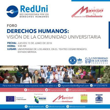 El jueves 13 de junio a las 8 y media de la mañana tendrá lugar en el Teatro César Rengifo el Foro “Derechos Humanos: Visión de la Comunidad Universitaria”, organizado por la Asociación Civil Mujer y Ciudadanía, como parte del proyecto RedUni, que es la Red Universitaria por los Derechos Humanos y que tiene como misión la integración y formación para la defensa de los Derechos Humanos de los miembros de la comunidad universitaria.