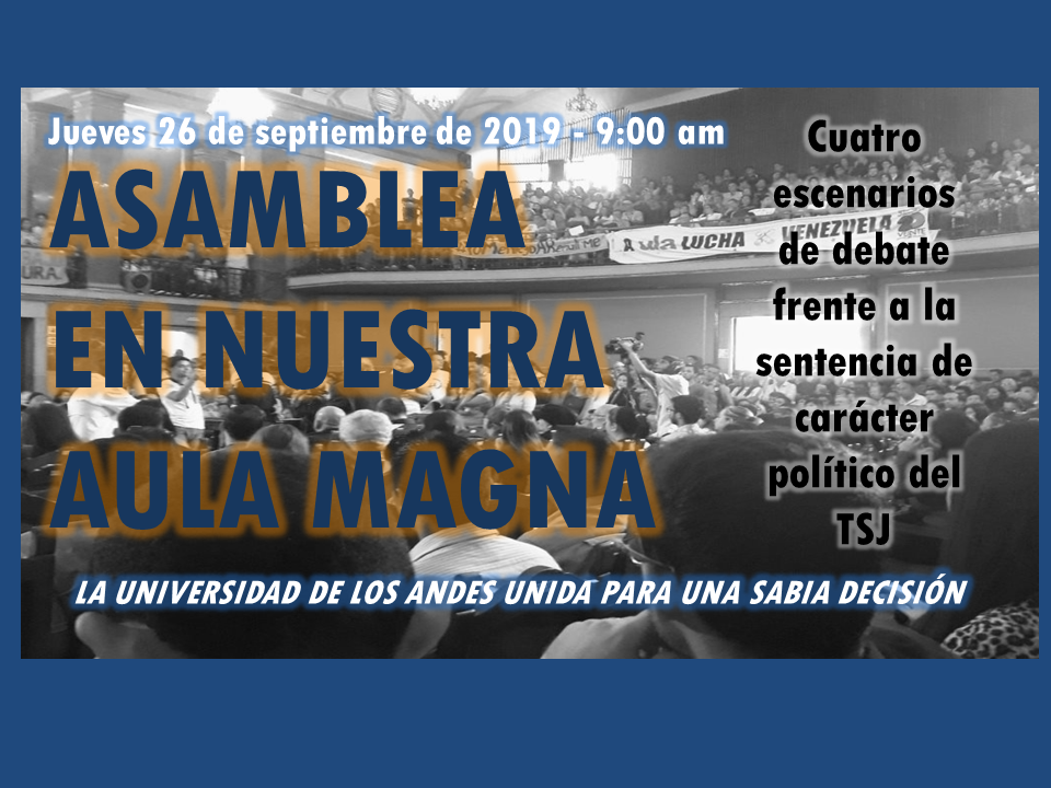 Con motivo de la sentencia 324 del 27/08/19 de la Sala Constitucional del TSJ, el Consejo Universitario acordó convocar a una Asamblea en el Aula Magna, en la que se fije postura y cursos de acción frente a este nuevo intento intervencionista y anti autonomista del régimen. Las conclusiones de esta Asamblea serán presentadas al Consejo Universitario que realizaremos este lunes 30 de septiembre de 2019.